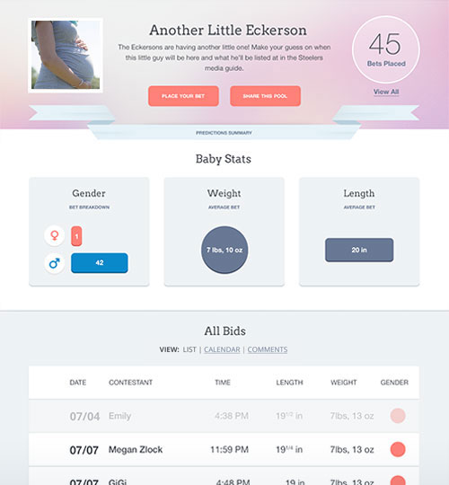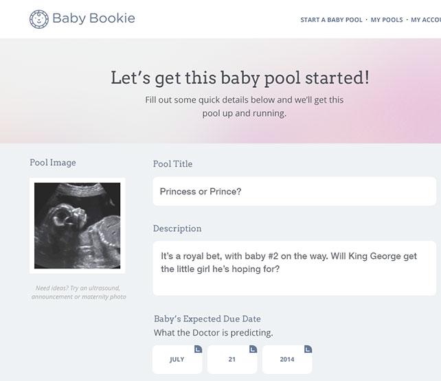Enter a few details about the upcoming baby and customize your pool. Then all you have to do is share the fun! Invite family and friends to place their bets.